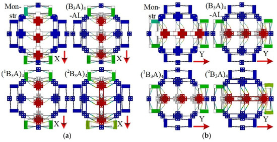 The motion range determines the workspace of an MPS. With the same inputting force in the X and Y direction, the FEA simulation results of Mon-str, (B3A)4-AL, (1B3A)4, and (2B3A)4 are shown in Figure 13a,b, respectively. The results listed in Table 3 indicate that the X and Y direction have same output displacement due to the decoupling structure. It can be concluded that with the same materials, Mon-str and (B3A)4-AL have the same displacement, while (1B3A)4 has maximum displacement due to its low stiffness. The motion range of the MPS can be adjusted by changing the materials of modules, compared with (B3A)4, (B3A)4-PLA, and (B3A)4-45. Therefore, modular MPSs can be regarded as another form of monolithic MPSs, and their reconfigurable characteristic lets them adapt to different requirements easily.