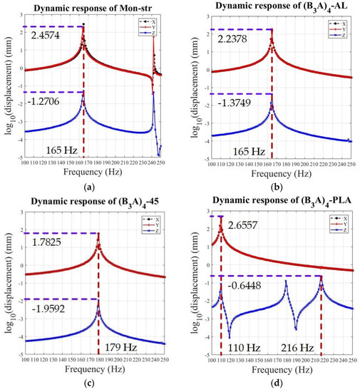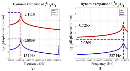 Firstly, when the input frequency is 165 Hz, the displacement in X, Y, and Z axes of Mon-str is larger than (B3A)4-AL, as shown in Figure 14a,b. Hence, with the same structure characteristic, the modular MPS possesses less displacement at the resonant frequency. Next, the harmonic response of (B3A)4 with different materials is depicted in Figure 14b–d, which indicates that a high natural frequency can be achieved by (B3A)4-45, and (B3A)4-PLA is not suitable for tasks requiring high dynamic response. Finally, the simulation results of (B3A)4-AL, (1B3A)4, and (2B3A)4 with different transmission modules are shown in Figure 14b,e,f. The dynamic performance of modular MPS can be improved by using distributed double-beam transmission modules. Considering the above analysis, the dynamic behaviors of modular MPSs can be improved by changing module materials or reconfiguration.