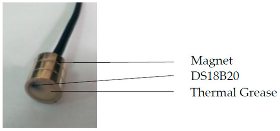 Model: DS18B20, resolution: 0.125 °C, temperature measurement range: −10–80 °C. The temperature sensor is installed by magnetic adsorption: the thermal grease and the sensor are encapsulated in a cylindrical magnet and installed by magnetic force, as shown in Figure 4.