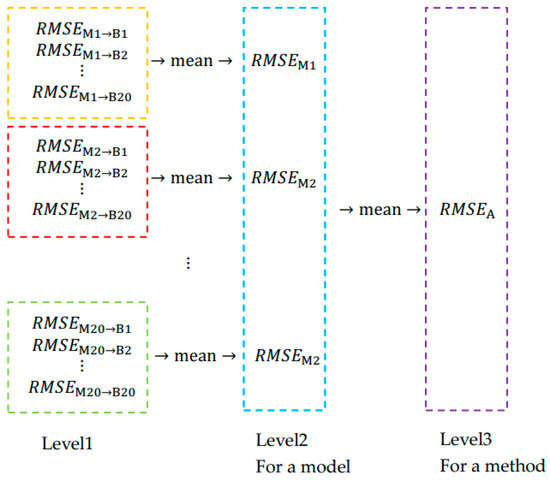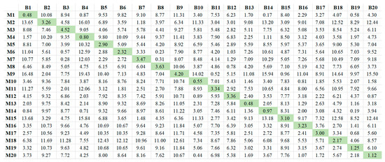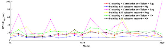 Models M1–M20 (TSPs: , , ridge regression, 60 data) were used to predict the first six data of B1–B20, and the RMSE, donated by was calculated. The thermal error model built by 60 data represents the thermal error law in one experiment, and represents the fit degree between the first six data and the thermal error model. The results are presented in Figure 14.