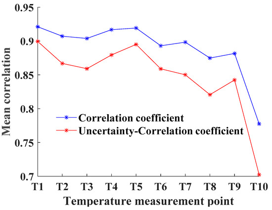 - For each temperature measurement point, the standard deviation () and mean uncertainty of the correlation coefficient of all batch data were calculated. The specific calculation methods are expressed by the following equation. The results are depicted in Figure 12. This process indicates the stability of the correlation.