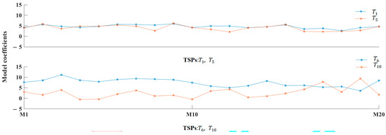 Model coefficients of stable TSPs (, ) and unstable TSPs (, ).