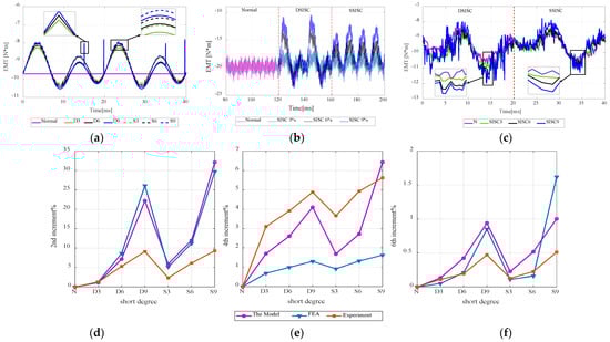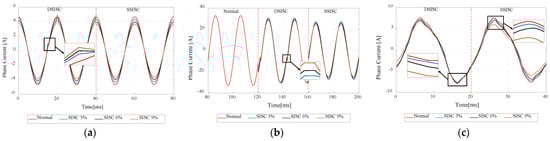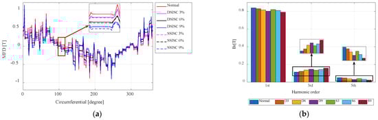 Figure 7, when DSISC occurred, the generator phase current curve was also “compressed”, but was affected by the reverse current of the short circuit pulse, and the absolute value of the current at position 1 increased with the degree of short circuit. With a short degree of aggravation, the amplitude of the first harmonic and the fifth harmonic gradually decreased, but the third harmonic rose. The air gap magnetic density followed the phase current and agreed with Equation (11).