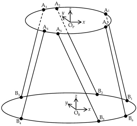 A parallel robot model is composed of a moving platform, a base, and six identical hydraulic cylinders with variable lengths, as shown in Figure 1. The moving platform’s position relative to the base can be controlled by varying the length of the six hydraulic cylinders. The parallel robot has six DOF. The base coordinate system OB-xyz is located in the center of the base. The mobile coordinate system OP-xyz is attached to the center of the moving platform. All vectors and matrices will be denoted in bold letters. The two coordinate systems OB-xyz and OP-xyz can be related to each other through a vector that describes the pose of the moving platform by its position (longitudinal (x), lateral (y) and vertical (z) displacements) and its orientation (Roll (ϕ), Pitch (θ) and Yaw (Ψ) angles). Thus, the position of the moving platform can be expressed by a position vector as