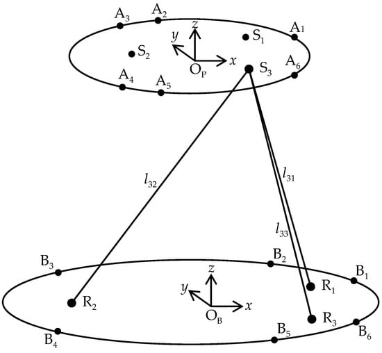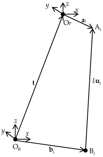 Referring to Figure 2 and Figure 3, is the unit vector along the ith hydraulic cylinder direction, and is the length of the ith hydraulic cylinder; is the position vector from OP to Ai and is represented in the mobile coordinate system OP-xyz, and is the position vector from OB to Bi and is represented in the base coordinate system OB-xyz. A vector chain equation can be expressed as