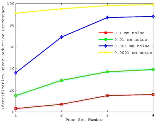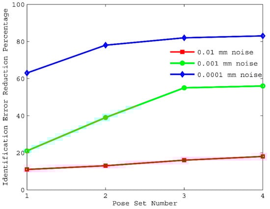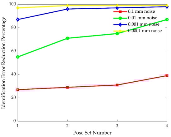 The effect of measurement noise on kinematic calibration is shown in Figure 9 and Figure 10. Notice that pose accuracy improves as measurement noise is reduced, and kinematic parameter errors are perfectly identified when measurement noise is close to zero. This shows that measurement noise should be at least an order of magnitude lower than the desired pose accuracy.