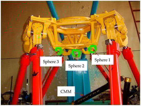 The experimental system mainly consisted of a parallel robot, a three-dimensional coordinate-measuring machine and six standard spheres. The experimental system for kinematic calibration based on L-infinity parameter estimation is shown in Figure 11. Pose measurement of the parallel robot was done with a precise three-dimensional coordinate measuring machine, model 3000i manufactured by STAR Tech. The measuring machine has a point repeatability of 0.010 mm and a length accuracy of 0.016 mm in the 1.2 m × 1.2 m × 1.2 m measuring range. Three of these spheres were fixed at three specific locations of the moving platform, and the other three were fixed at three specific base locations. On this basis, pose measurement of the parallel robot was developed, which mainly measured the distances from three standard spheres on the moving platform to three standard spheres on the base by the coordinate-measuring machine. Then, the poses were computed using these distances, as shown in Figure 12. It is worth mentioning that the kinematic calibration experiments were performed in a limited area due to the length measurement limitation of the coordinate-measuring machine.