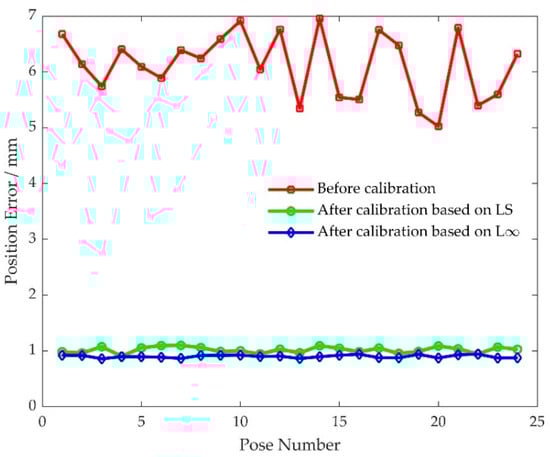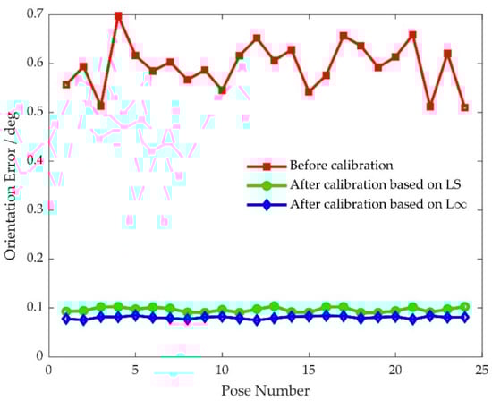 Pose error measurement and kinematic parameter error identification were accomplished by using the original 32 pose errors at the measurement poses listed in Table 6. Then a new round of pose measurement was performed to evaluate pose accuracy after the two kinematic calibrations. The pose errors at verification poses based on the two kinematic calibrations were obtained and are shown in Figure 13 and Figure 14, and the four pose error indicators before and after kinematic calibration are listed in Table 7. The maximum position error after kinematic calibration by using conventional least squares algorithm was 1.0980 mm, and the maximum position error after kinematic calibration by using the proposed L-infinity parameter identification algorithm was 0.9408 mm. The maximum orientation errors were 0.1037 and 0.0848 degree, respectively. The maximum position error based on least squares was reduced by 84.22%, and the maximum position error based on L-infinity was reduced by 86.48%. The maximum orientation errors were reduced by 85.14% and 87.85%, respectively. The range of position error based on least squares is reduced by 85.76%, and the range of position errors based on L-infinity was reduced by 87.01%. The range of orientation errors were reduced by 87.67% and 88.99%, respectively. The percentage reductions of average error and root-mean-square error for a conventional least squares algorithm were almost identical at 83.37% and 83.42%, respectively. The percentage reductions of average error and root-mean-square error for the L-infinity parameter identification algorithm was similar to the conventional least squares algorithm. The two errors were 85.29% and 85.34%, respectively. Clearly, both kinematic calibrations can improve pose accuracy, while kinematic calibration based on the L-infinity parameter identification algorithm is much better than the conventional least squares algorithm. This verifies that the proposed kinematic calibration based on the L-infinity parameter identification algorithm is effective and can achieve strict bounds on the pose errors produced by the parallel robot.
