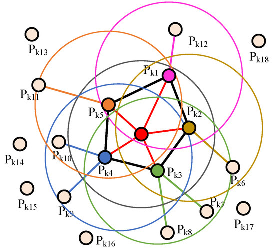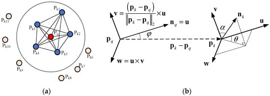 PFH parameterizes the spatial difference between a reference point and its neighborhood to form a multidimensional histogram describing the geometric properties of the point neighborhood. The multidimensional space where the histogram is located provides a measurable information space for feature expression and is robust to pose, sampling density, and noise of 3D surfaces. As shown in Figure 6a, represents the sampling point (red). The scope of PFH is a sphere with as the center and radius . Other points in the scope contribute to the PFH of (blue). After obtaining all the neighboring points in the k neighborhood of sampling point , a local coordinate system, , is established at Pq, as shown in Figure 6b, where represents a neighborhood point, and and represent the normal at and , respectively.