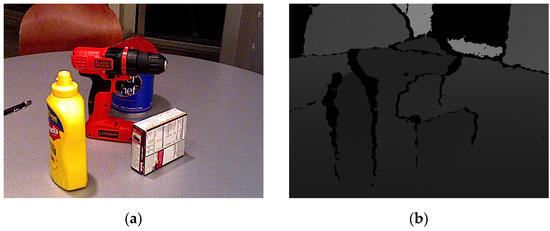 An example of an RGB-D image in the YCB dataset. (a) RGB image; (b) depth image.