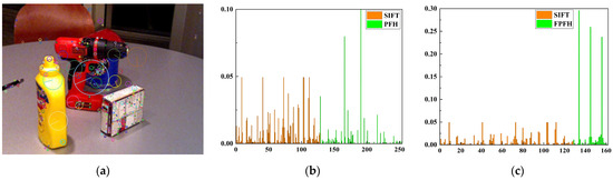 The performance of the proposed feature extraction and fusion method is verified on the RGB-D datasets of YCB and Karlsruhe Institute of Technology and Toyota Technological Institute (KITTI). The specific index parameters characterizing the performance of the descriptor are the number and time of feature extraction, the number and time of feature matching, and the matching failure rate. The definition of the matching failure rate (MFR) is as follows.