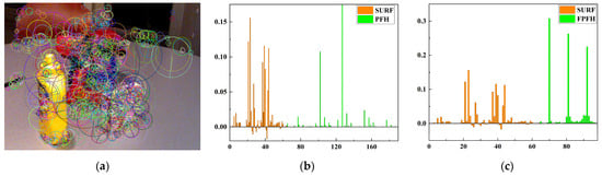 Extracted SURF feature points and feature histograms of SURFPFH and SURFFPFH at pixel (374, 373). (a) Extracted SURF feature points; (b) SURFPFH feature histogram; (c) SURFFPFH feature histogram.