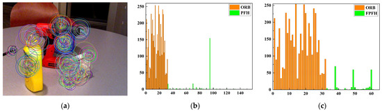 Extracted ORB feature points and feature histograms of ORBPFH and ORBFPFH at pixel (374, 373); the norm of PFH or FPFH here is 256. (a) Extracted ORB feature points; (b) ORBPFH feature histogram; (c) ORBFPFH feature histogram.