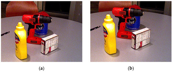 The sample image of the YCB dataset is shown in Figure 12, and its indices are shown in Table 1. A sample image of the KITTI dataset is shown in Figure 13, and its indices are shown in Table 2. In Table 1 and Table 2, Ne indicates the number of extracted feature points, Nm indicates the number of matched feature points, Te indicates the time of feature extraction, Tm indicates the time of feature matching, and Ta indicates the total time.