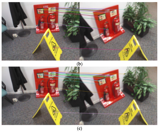 Examples of successful registration of ORBPFH and ORBFPFH but failed registration of ORB. (a) ORB registration of frames 1 and 92 in the KITTI fire dataset. (b) ORBPFH registration of frames 1 and 92 in the KITTI fire dataset. (c) ORBFPFH registration of frames 1 and 92 in the KITTI fire dataset.