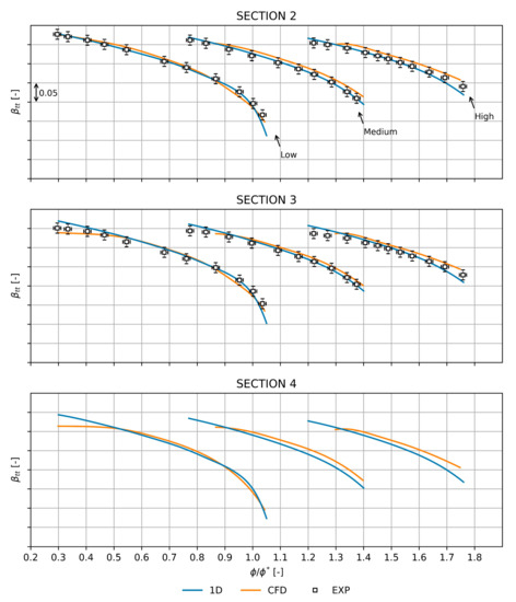 The comparison shown in Figure 6 highlights how the 1D model can replicate the experimental data in terms of . Compared with the CFD results, the 1D predictions appear closer to the experimental measurements, as evidenced by an average percentage error of 2.10% instead of 3.25% for the CFD analysis. This trend remained unaltered at the exit of the volute (section 4).