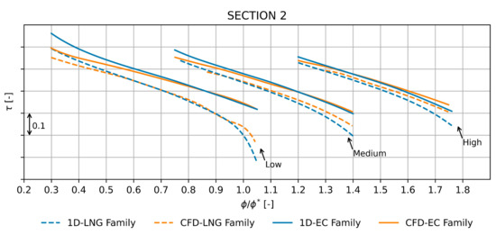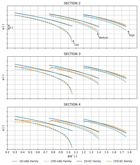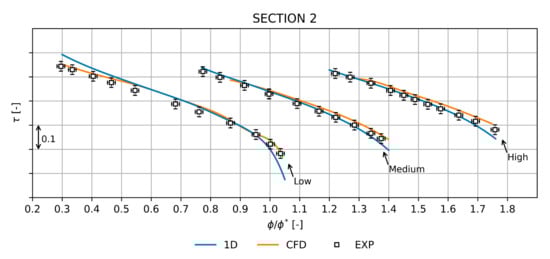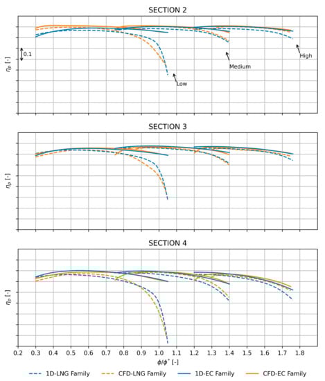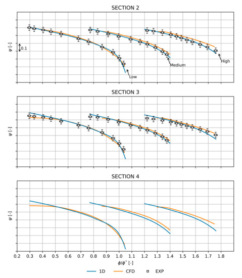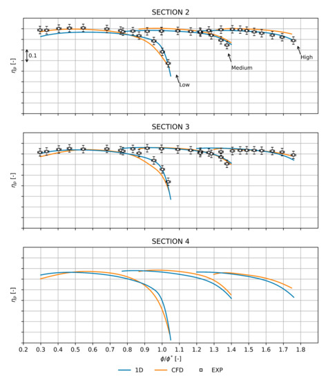 Regarding the work coefficient (Figure 5), the medium and high flow coefficient stages showed a 1D prediction close to the CFD and experimental data. Indeed, the average percentage error in these cases was about 1.15%, while for the low flow stage it rose to 2.88%. In Figure 5 only section 2 is shown, since the diffuser and volute, being static components, do not increase the total enthalpy rise of the stage.