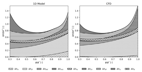 Loss source breakdown evaluated with the 1D model (left) and CFD (right) for the medium flow stage.