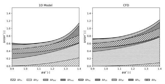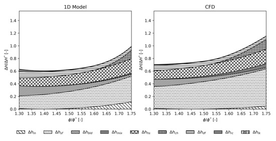 Loss source breakdown evaluated with the 1D model (left) and CFD (right) for the high flow stage.