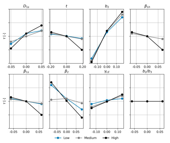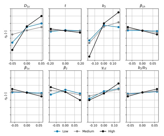 The ANOVA was performed to assess the impact on stage performance of each independent variable of Table 4, thus excluding non-significant ones from the study. To conduct the ANOVA, the values of the independent variables were varied by creating a set of 6561 possible geometries, where , , and the number of blades were fixed to meet the new family requirements. Figure 10 and Figure 11 depict the ANOVA outcomes (in terms of main effect plot) related to and , for the low (blue), the medium (gray), and the high flow coefficient stage (black), respectively. Similar results were achieved for and but were not reported here for the sake of brevity. Figure 10 and Figure 11 prove that none of the independent variables of Table 4 had a negligible impact on the stage performance. Hence, all independent variables were considered in the next steps of the present study to feed and train the ANNs and derive the new centrifugal compressor family.