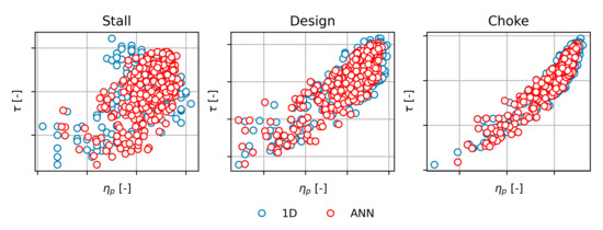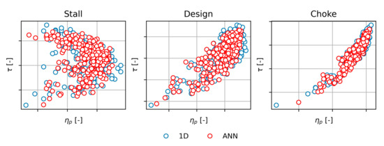Comparison of 1D prediction (blue dots) and ANN forecast (red dots) under stall, design, and choke conditions for the low flow designed impeller.