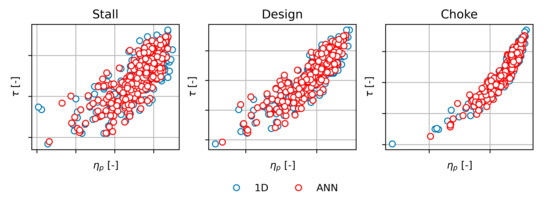 Then, 2500 possible realistic geometries were achieved by combining the values of the independent variables. Next, each of these geometries was analyzed with the 1D model to predict total-to-total pressure ratio, polytropic efficiency, work coefficient, and polytropic head (Equations (1)–(4)) at section 4 (Figure 1a) for stall, design, and choke conditions. Subsequently, a dataset composed by the values of the significant independent variables and the respective performance predictions was collected and used to train and validate an ANN. The Sobol sequence was adopted to link variables with quasi-random values based on Burhenne et al. [73]. Indeed, as stated by the authors themselves, when a large number of independent input variables are affecting a problem, the Sobol sequence is more effective than other sequences such as Latin Hypercube or Monte Carlo sampling.