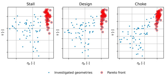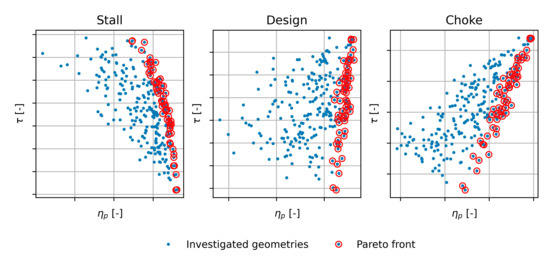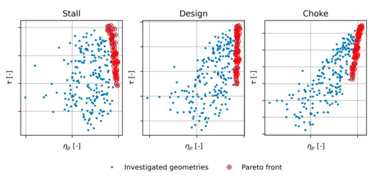 Once the ANNs were trained and validated, such meta-models were used in conjunction with a random search algorithm [75] to predict, for each of the three stages, the performance of a new sample of possible geometries. Based on the achieved predictions, three Pareto fronts were built, one for each stage.