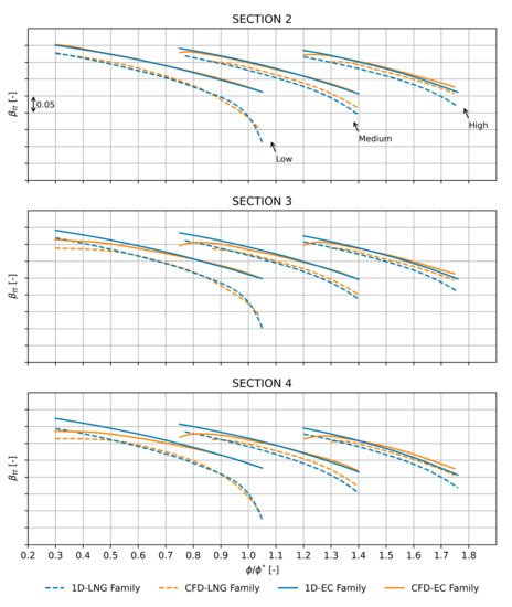 The methodology proposed in Section 2 was applied, as an example case study, to derive a new family of EC impellers from an existing family of LNG centrifugal compressors. For the sake of clarity, instead of showing the results obtained for each impeller of the family, the results are shown for three different stages characterized by low, medium, and high flow, respectively. Indeed, these stages are well representative for the whole family and the obtained considerations could be easily extended to intermediate stages. The following subsections describe and discuss the achieved results following the subdivision provided in Section 2.