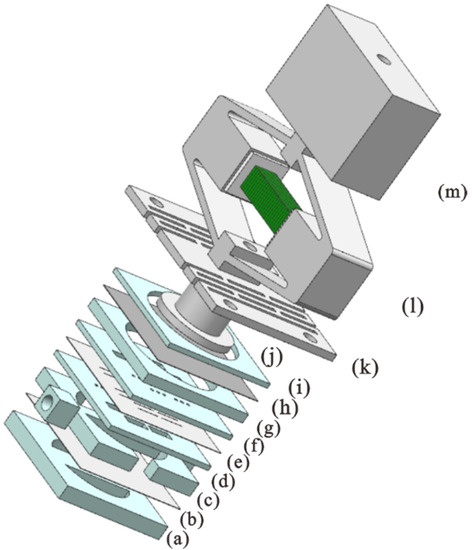 Figure 1. Exploded view of the piezoelectric pump: (a) compressible spaces plate, (b) silicone diaphragm, (c) flow channel plate, (d,f) check valves seat plate, (e) film of check valves, (g) pump channel plate, (h) PVC diaphragm, (i) fixed plate, (j) coupler, (k) slotted beam, (l) displacement amplifier and piezoelectric stack, and (m) mass block.