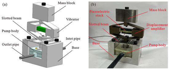 The three-dimensional (3D) picture and a photograph of the piezoelectric pump is shown in Figure 2a,b. This pump is mainly composed of a piezoelectric vibrator, pump body, and base. The pump body is fixed in the U-shaped base and connected with the vibrator through the coupler. The manufacture of a resonant piezoelectric pump mainly includes a piezoelectric stack, displacement amplifier, slotted beam, pump body, and U-shaped base.