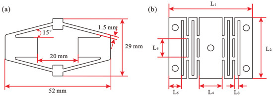 The displacement amplifier is made of 65 manganese steel and processed using the drilling machine and the wire cutting machine, with a size of 52   mm   ×   29   mm   ×   10   mm . The structure and parameters of the displacement amplifier are shown in Figure 3a. When assembling the piezoelectric stack, the short axis direction of the displacement amplifier is fixed with a clamp, and the applied preload is measured with a pressure sensor. An alumina sheet is placed at both ends of the piezoelectric stack to insulate it from the displacement amplifier and fill in the gap, and then it is placed in the middle of the displacement amplifier. When the preload is 400 N, the clamp is loosened, and the piezoelectric stack will be clamped on the displacement amplifier, thereby completing the preloading of pressure.