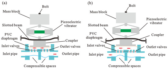 The operation principle of the diaphragm pump is shown in Figure 4. In the resonant state, the dispensing mode is shown in Figure 4a, and the displacement amplifier drives the slotted beam to bend and pushes the coupler to work downward, resulting in a reduction in the pump channel volume. As the pump chamber volume decreases and pressure increases, the inlet valves close and the outlet valves open. The liquid is squeezed out of the pump chamber through the out valves. Moreover, the liquid can immediately enter the compressible space instead of pushing all the liquid in the outlet pipe to move together. In the resonant state, the absorbing mode is shown in Figure 4b, and the displacement amplifier drives the slotted beam to bend and pushes the coupler to work upward, resulting in an increase in the pump channel volume. As the pump chamber volume increases and the pressure decreases, the inlet valves open and the outlet valves close. The compressible spaces at the inlet can reduce water flow load during suction. The resonant vibrator achieves the reciprocating motion in two modes and the check valves have one-way conduction characteristics, so the liquid is continuously input from the inlet pipe to the outlet pipe. The elastic compressible cavity structure can reduce the burden of the actuator, play the role of two energy accumulators, reduce the dynamic load of fluid quality, eliminate the fluctuation of flowing liquid, and increase the output flow of the pump system by about 20% [14].
