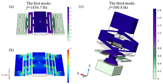 Figure 5. (a) Modal simulation result of the slotted beam; (b) static structural simulation result of the slotted beam; (c) modal simulation result of piezoelectric pump.