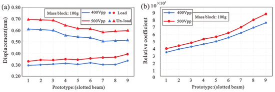 As an elastic element, a slotted beam forms a spring damping system with the pump body, so the stiffness of the slotted beam is an important factor. The structure of the slotted beam can make the beam have significant deformation and elasticity. Nine kinds of slotted beams with different stiffnesses (Table 1) are designed for comparison. The output amplitude of the vibrator under unload and load is studied, and the experimental results are shown in Figure 8a. When the vibrator is unloaded, the displacement decreases gradually with the stiffness coefficient. When the vibrator is loaded (driving fluid), the displacement increases gradually with the stiffness coefficient. Therefore, with the increase in stiffness coefficient, the displacement difference between unload and load becomes smaller. This is reflected in the increasing ability of the vibrator to overcome liquid resistance. According to Equation (6), Matlab/Simulink analysis is carried out when the driving voltage and equivalent mass remain unchanged. The stiffness and amplitude are variables, and the inertial output force is a dependent variable. An output inertial force coefficient R is obtained through calculation. As shown in Figure 8b, the output inertial force gradually increases with stiffness. Compared with the experimental phenomenon, it is proven.
