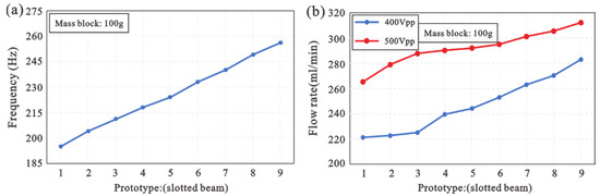 When the vibrator drives the pump body to work, the resonant frequency and maximum flow rate are studied as follows. Figure 9a shows that the greater the stiffness coefficient of the slotted beam, the higher the resonant frequency. The flow rate trend in Figure 9b corresponds to the displacement. The experimental results show that within a certain stiffness coefficient range, the greater the stiffness coefficient, the greater the output inertial force. Therefore, the output performance of the piezoelectric pump is better.