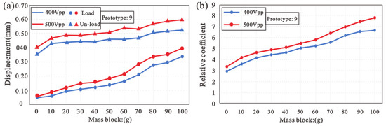 Using the slotted beam of Prototype 9, the influence of the mass block on output performance is studied. In this study, the displacement of the vibrator with different mass blocks under unload and load are measured, as shown in Figure 10a. When the vibrator is unloaded and loaded (driving fluid), the displacement increases gradually with the increase in mass block. However, with the increase in mass, the displacement difference between unload and load decreases gradually, that is, the ability to overcome liquid resistance becomes stronger and stronger. This is reflected in the increasing ability of the vibrator to overcome liquid resistance. Through Equation (6), when the driving voltage and stiffness coefficient remain unchanged, the equivalent mass and amplitude are changed, and the output inertial force coefficient R is obtained by Matlab/Simulink analysis. As shown in Figure 10b, with an increase in mass blocks, an upward trend is shown. Theoretical analysis and experimental results show that the higher the mass block, the greater the inertial output force, and the better the output performance of the piezoelectric pump.