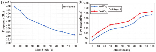 Figure 11. Influence of the mass block on (a) frequency, (b) flow rate.