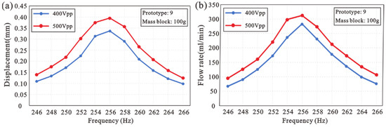 The piezoelectric pump with the slotted beam of Prototype 9 and a 100 g mass block is studied. The displacement and flow rate characteristics varying with frequency under zero backpressure are studied. The experimental results are shown in Figure 12a,b, and the relationship between the tip displacement (peak–peak value) of the vibrator and excitation frequency presents a typical resonance curve. When the driving frequency deviates from the resonant frequency, the displacement of the vibrator decreases significantly. When the driving frequency is 256 Hz, displacement and flow rate are the largest. When the driving voltage is 400 V pp , the maximum displacement is 0.337 mm and the maximum flow rate is 283 mL   min 1 . When the driving voltage is 500 V pp , the maximum displacement is 0.395 mm and the maximum flow rate is 312.2 mL   min 1 .
