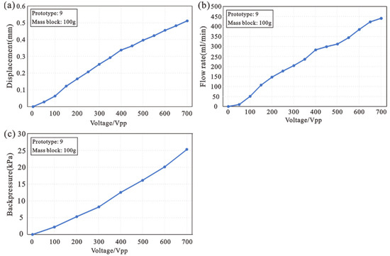 Figure 13. Influence of the driving voltage on (a) displacement, (b) flow rate, and (c) backpressure.