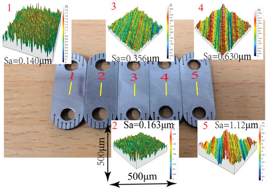 The three-dimensional contact profiler is used to measure the magnetic conductive sheet (MCS) of a GMT (see [7]) with different roughnesses, as shown in Figure 1. The yellow line is the center of the measurement position and is measured at the center. The material is electrical pure iron, the elastic modulus is 195 MPa, Poisson’s ratio is 0.29, the roughness of the measurement sample is 0.356 μm, the minimum sampling distance of the rough surface measuring instrument is 0.25 μm, and the sampling length is 4 mm. The results of D and G can be obtained using the structural function method [27]. The summary data is shown in Table 1.