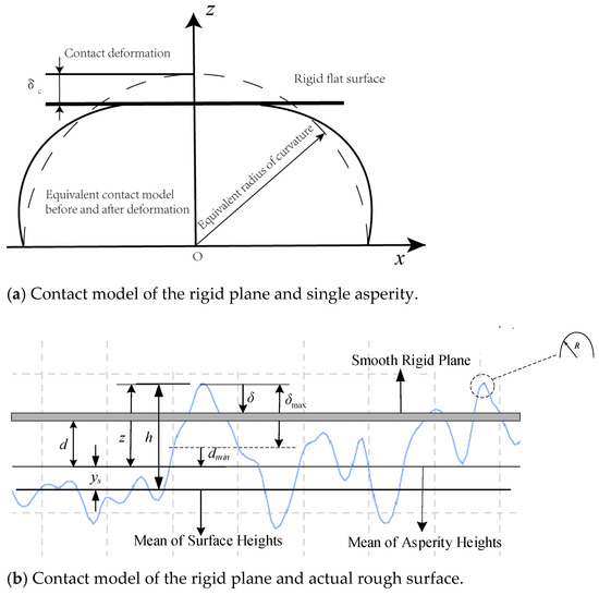Figure 2 illustrates the conceptual approach to the contact between a rigid plane and a rough surface. According to Hertz’ contact theory, the contact between two rough -surface asperities is equivalent to the contact between the rigid plane and spherical asperities. To obtain the contact deformation force under a given size, the contact deformation between spherical asperities and a rigid plane must be first obtained. If the maximum contact area of the asperity is , the number of asperities larger than the contact area a can be expressed as N, and the area distribution density of the contact point can be expressed as [27]: