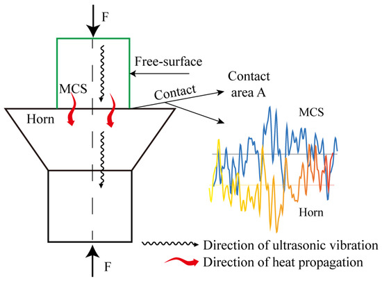 Microscopically, the rough interface contact between the MCS and the horn manifests as mutual contact between the asperities, which is further manifested as peak-to-peak contact between the asperities. We did not consider other contact types, such as side contact or mixed contact. When the heat flow propagates at two rough contact interfaces, it produces thermal shrinkage, namely shrinkage thermal resistance. The degree of heat flow contraction is inversely proportional to the number of contacted asperities. According to the classical truncated cone contact model, the thermal shrinkage resistance at the contact point of a single asperity can be expressed as [28]: