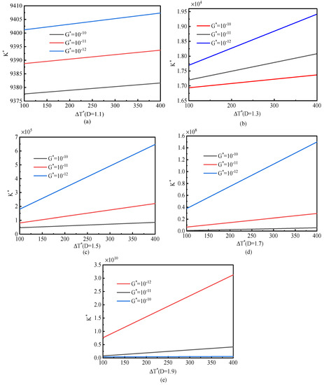 Regarding the effects of temperature on the elastic modulus E and linear expansion coefficient, it is necessary to take corresponding values according to the variable physical parameters of related materials. The results, K*, as shown in Figure 4 are expressed as a function of the dimensionless temperature change (). D is taken as 1.1–1.9, G is taken as 10−10, 10−11, and 10−12. As shown in the Figure 4, when the modified fractal model considering temperature deformation is considered, the dimensionless contact stiffness K* increases with the increase in and presents a robust linear relationship. For the same change temperature, K* decreases with the increase in G within a specific range, and this change becomes particularly significant at G = 10−12, while it becomes an inclined line with a small slope at G = 10−10 . The increase in G indicates the increase in roughness of a rough surface, and the elastic contact percentage of the thermal effect between rough contact surfaces decreases, indicating that the minor roughness of the joint surface has a significant influence on the thermal effect of the interface.