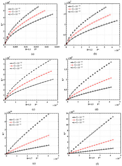 Influence of length scale parameter G* on -K* curve with = 300; (a) D = 1.1 (b) D = 1.2 (c) D = 1.3 (d) D = 1.5 (e) D = 1.7 (f) D = 1.9.