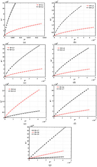 Influence of fractal dimensions D on -K* curve with = 300; (a) D = 1.1, 1.2 (b) D = 1.2, 1.3 (c) D = 1.3, 1.4 (d) D = 1.4, 1.5 (e) D = 1.5, 1.6 (f) 1.6, 1.7 (g) 1.7, 1.8, 1.9.