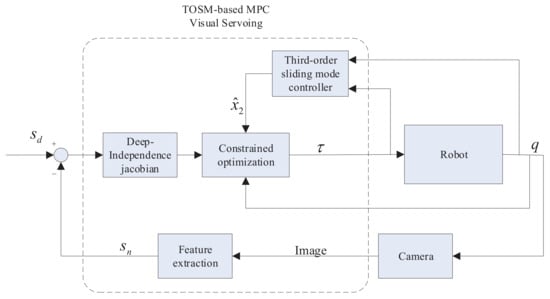 In the preceding section, joint velocities and system centralized uncertainty were effectively estimated by designing an SMO. In this section, an MPC-based controller is designed for solving system constraints and model uncertainty, so that image feature points converge to expected values. Figure 3 reflects the overall control scheme. The control instruction is the joint torque of the robot manipulator and the output is the joint angle q. The system uncertainty is estimated using an SMO in the feedforward loop.