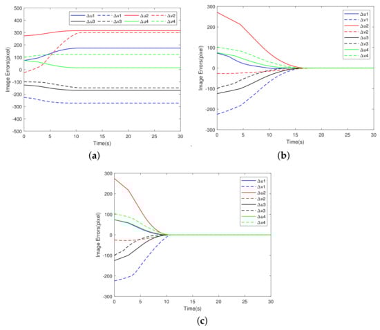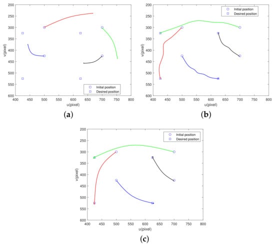 Trajectories of the image features of comparative simulations with model uncertainty. (a) Trajectories of the image features in Case 1. (b) Trajectories of the image features in Case 2. (c) Trajectories of the image features in Case 3.