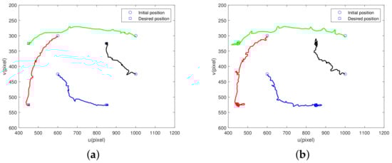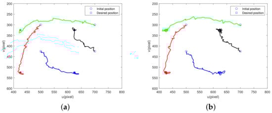 Trajectories of the image features of comparative simulations with time-varying external disturbances for the 2-DOF robot manipulator. (a) Trajectories of the image features in Case 3. (b) Trajectories of the image features in Case 4.