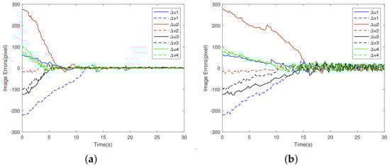 Trajectories of the image features of comparative simulations with time-varying external disturbances for the 6-DOF robot manipulator. (a) Trajectories of the image features in Case 3. (b) Trajectories of the image features in Case 4.