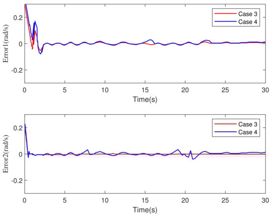 Velocity estimation errors with time-varying external disturbances in Case 3 and Case 4 for the 2-DOF robot manipulator.